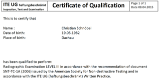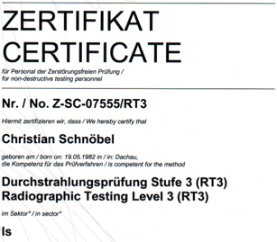 - • Durchstrahlungsprüfung Stufe 3 ISO 9712 und Level III nach Written Practice (SNT-TC-1A)