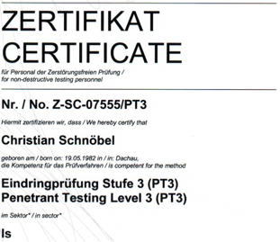 - • Farbeindringprüfung Stufe 3 ISO 9712 und Level III nach Written Practice (SNT-TC-1A)