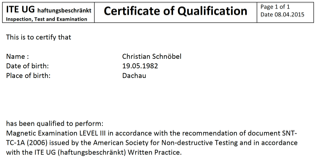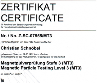 - • Magnetpulverprüfung Stufe 3 ISO 9712 und Level III nach Written Practice (SNT-TC-1A)