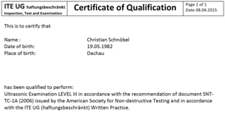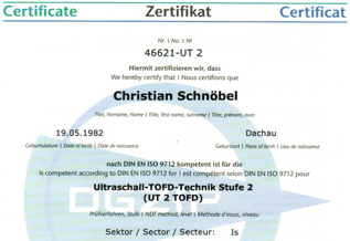 - • Ultraschallprüfung Stufe 3 ISO 9712 und Level III nach Written Practice (SNT-TC-1A)