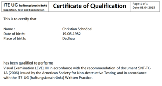 - • Sichtprüfung Stufe 3 ISO 9712 und Level III nach Written Practice (SNT-TC-1A)